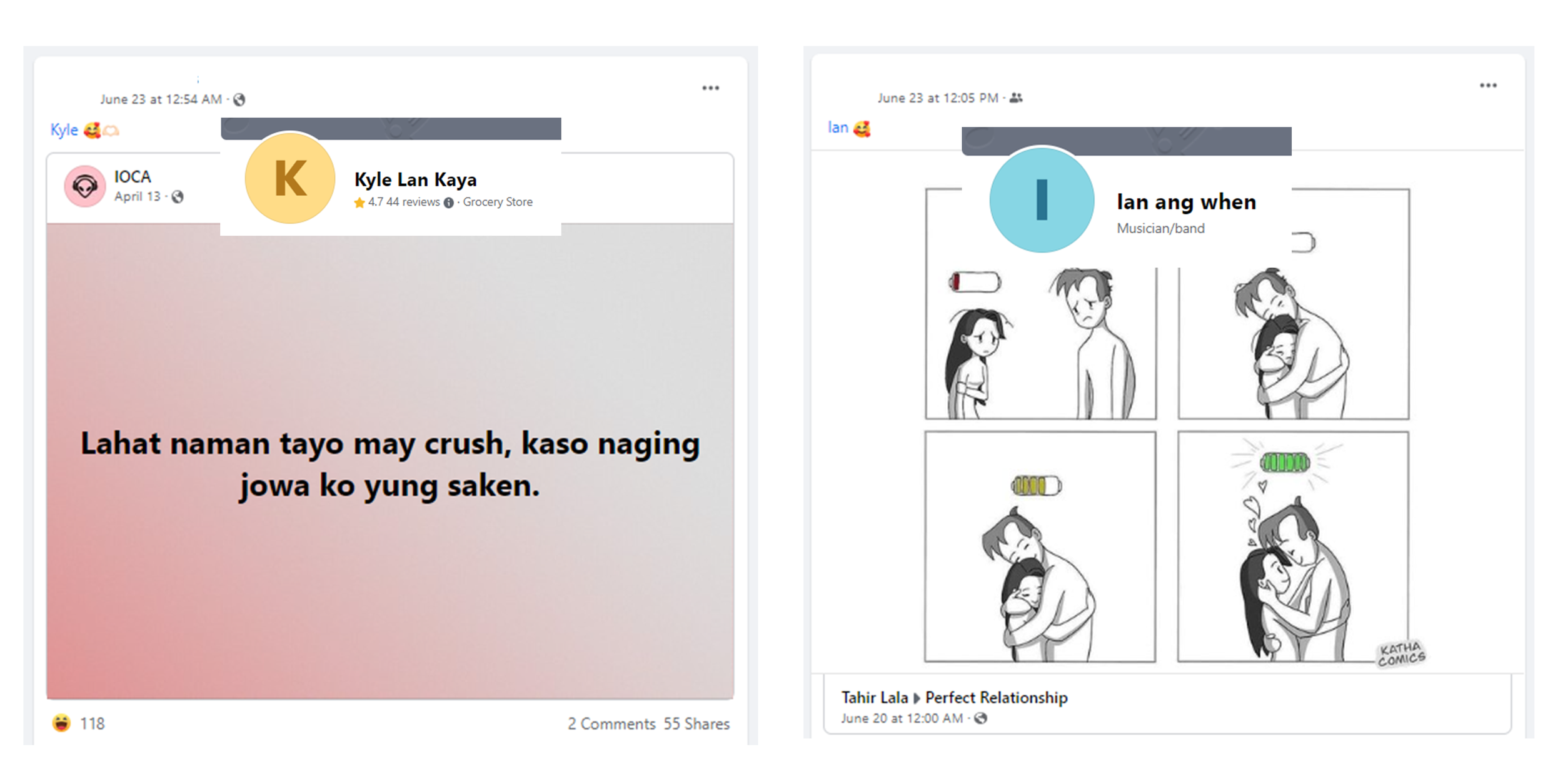 Kyle Lan Kaya? Last week, a flurry of people on Facebook have been sharing love life-related posts, all tagging supposedly the same guys nicknamed “Kyle” and “Ian”. However, upon checking the profiles of each “guy”, you will only be redirected to Facebook pages that say “Kyle Lan Kaya” or “Ian Ang When”. “Kyle Lan Kaya” and “Ian ang when” are both wordplays for “kailan kaya?” or, in English, “when would it be?”. In a sense, it could be the new “Sana all” trend, where people wish that everyone experiences the same great things, but more commonly associated with love matters.